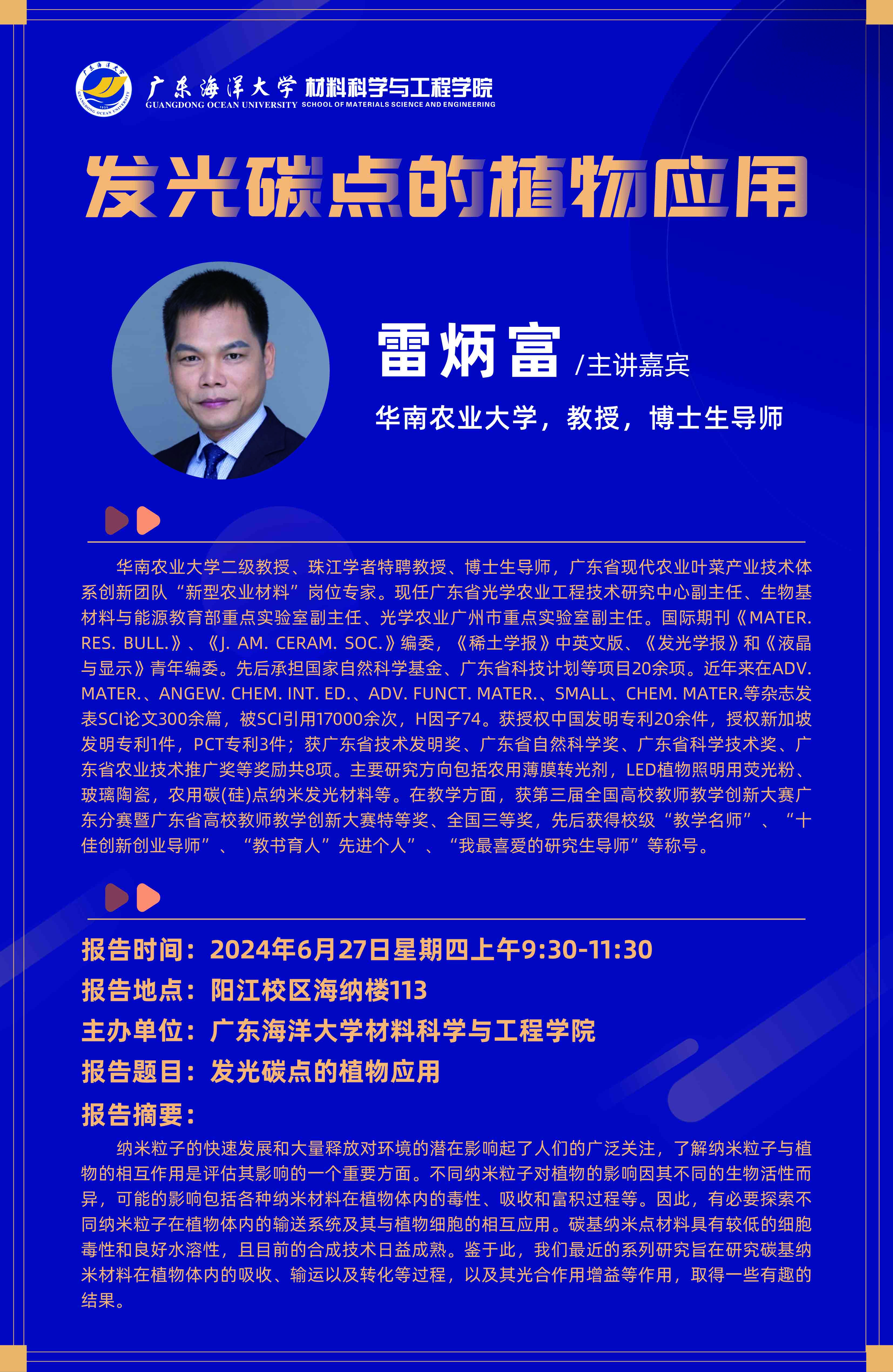 主讲嘉宾:雷炳富,华南农业大学二级教授、珠江学者特聘教授、博士生导师,广东省现代农业叶菜产业技术体系创新团队“新型农业材料”岗位专家。现任广东省光学农业工程技术研究中心副主任、生物基材料与能源教育部重点实验室副主任、光学农业广州市重点实验室副主任。国际期刊《Mater. Res. Bull.》、《J. Am. Ceram. Soc.》编委,《稀土学报》中英文版、《发光学报》和《液晶与显示》青年编委。先后承担国家自然科学基金、广东省科技计划等项目20余项。近年来在Adv. Mater.、Angew. Chem. Int. Ed.、Adv. Funct. Mater.、Small、Chem. Mater.等杂志发表SCI论文300余篇,被SCI引用17000余次,H因子74。获授权中国发明专利20余件,授权新加坡发明专利1件,PCT专利3件;获广东省技术发明奖、广东省自然科学奖、广东省科学技术奖、广东省农业技术推广奖等奖励共8项。主要研究方向包括农用薄膜转光剂,LED植物照明用荧光粉、玻璃陶瓷,农用碳(硅)点纳米发光材料等。在教学方面,获第三届全国高校教师教学创新大赛广东分赛暨广东省高校教师教学创新大赛特等奖、全国三等奖,先后获得校级“教学名师”、“十佳创新创业导师”、“教书育人”先进个人”、“我最喜爱的研究生导师”等称号。