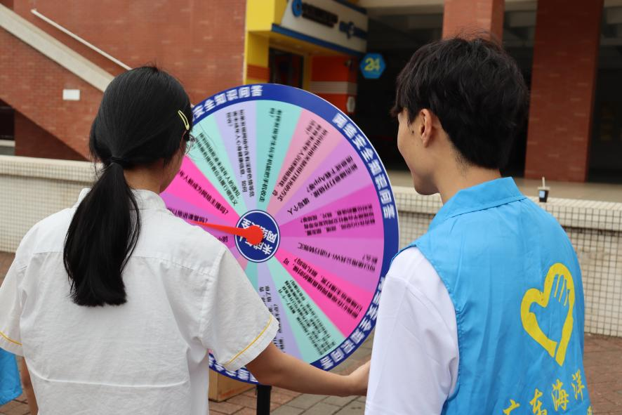 “法律知多少”智慧转盘:将《民法典》《未成年人保护法》等法律知识融入趣味问答,学生通过转盘答题赢取海大定制文具,在轻松氛围中学习法律常识。