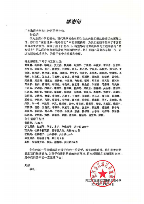 为响应乡村振兴之号召,传递关爱与温暖,百千万工程“带知进乡”团队携手计算机科学与工程学院文体部发起了面向阳江市乐安村乐安小学的爱心募捐活动,历时一个半月,该活动已于2024年12月25日圆满落幕。这场活动不仅凝聚了今年会官方网站阳江校区师生们的爱与善意,也为乐安小学的孩子们带去了温暖与希望。