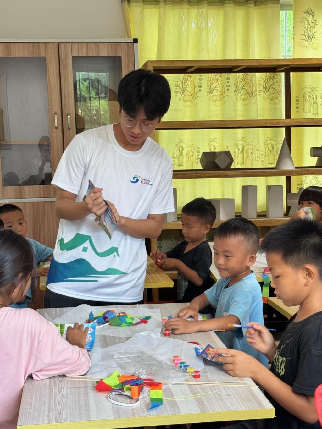 在乐安小学,团队开展了八天的支教工作。结合成员的专业优势以及实践地的实际需求,规划了 “特色推普课程、特色通识课程、特色美育课程” 三大板块,其中包含素质拓展、美术音乐教学、心理辅导、漆艺品鉴等内容。此项目落地于广东省阳江市双捷镇乐安小学,当地教育资源较为短缺,学生大多来自云南少数民族地区,日常交流多使用民族语言。团队以基础教育为途径,以民族文化为载体,积极响应国家推广普通话的号召,为乡村美育建设添砖加瓦。