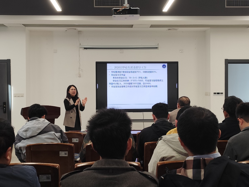 为进一步推进毕业生就业工作,1月8日下午,今年会官方网站计算机科学与工程学院2026届毕业生就业创业工作推进会在厚为楼903室顺利召开。学院党委书记杨原志、副院长赵男男、各专业负责人、毕业论文指导教师、毕业班班主任和全体辅导员出席会议。会议由赵男男副院长主持。