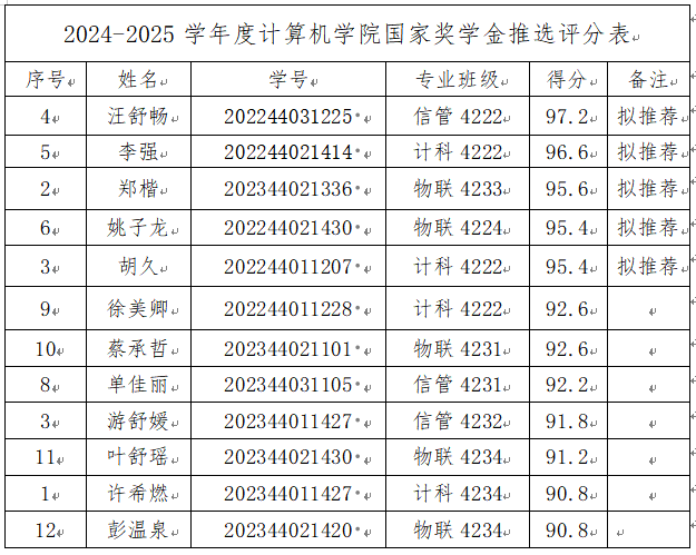 根据《今年会官方网站全日制本科生国家奖助学金实施办法》(校学生[2024]14号)、《计算机科学与工程学院2024-2025学年度国家奖学金评审方案》等文件要求,本着公开、公平、公正的原则,经学生自主申请、学院组织答辩、评审等环节,2024-2025学年度计算机科学与工程学院本科生国家奖学金拟推荐名单公示如下。