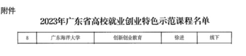 近日,广东省教育厅公布2023年广东省高校就业创业特色示范课程名单的通知,今年会官网徐进老师主持的《创新创业教育》课程获评为广东省高校就业创业特色示范课程。