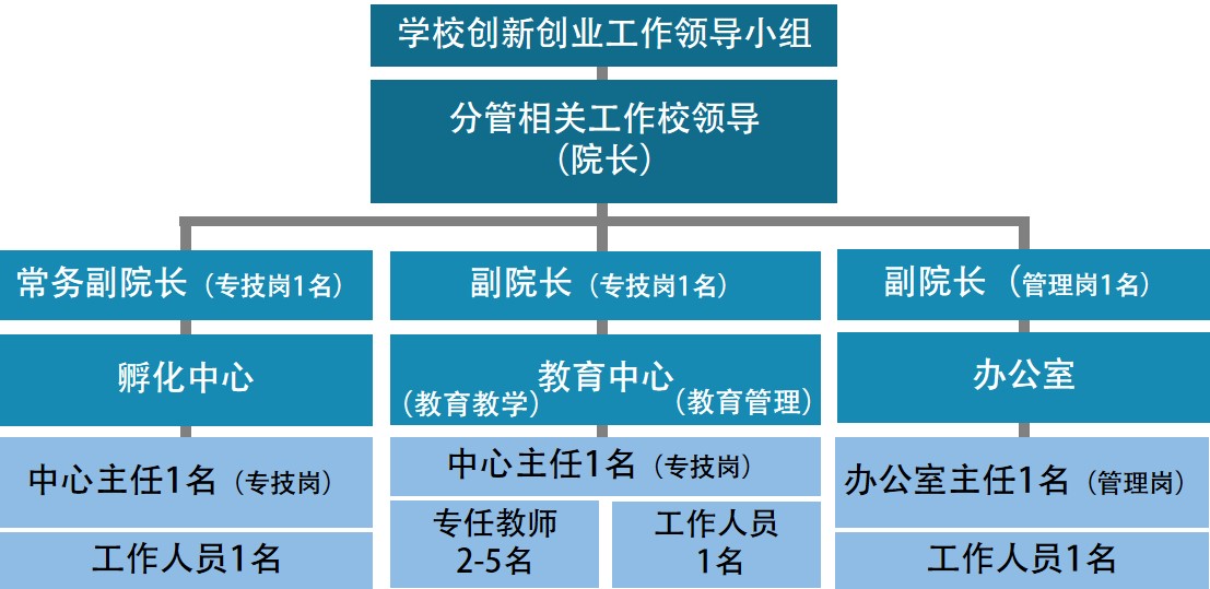 学院由分管本科教学工作校领导兼任院长。设专职常务副院长1名(正处职,专技岗)、专职副院长2名(副处职,专技岗1人,管理岗1人);设创新创业教育中心、孵化中心、办公室三个科室,各设主任1名、其他工作人员1-2名,设专职教师岗位2-5人,兼职教师若干。组织机构图如上图。