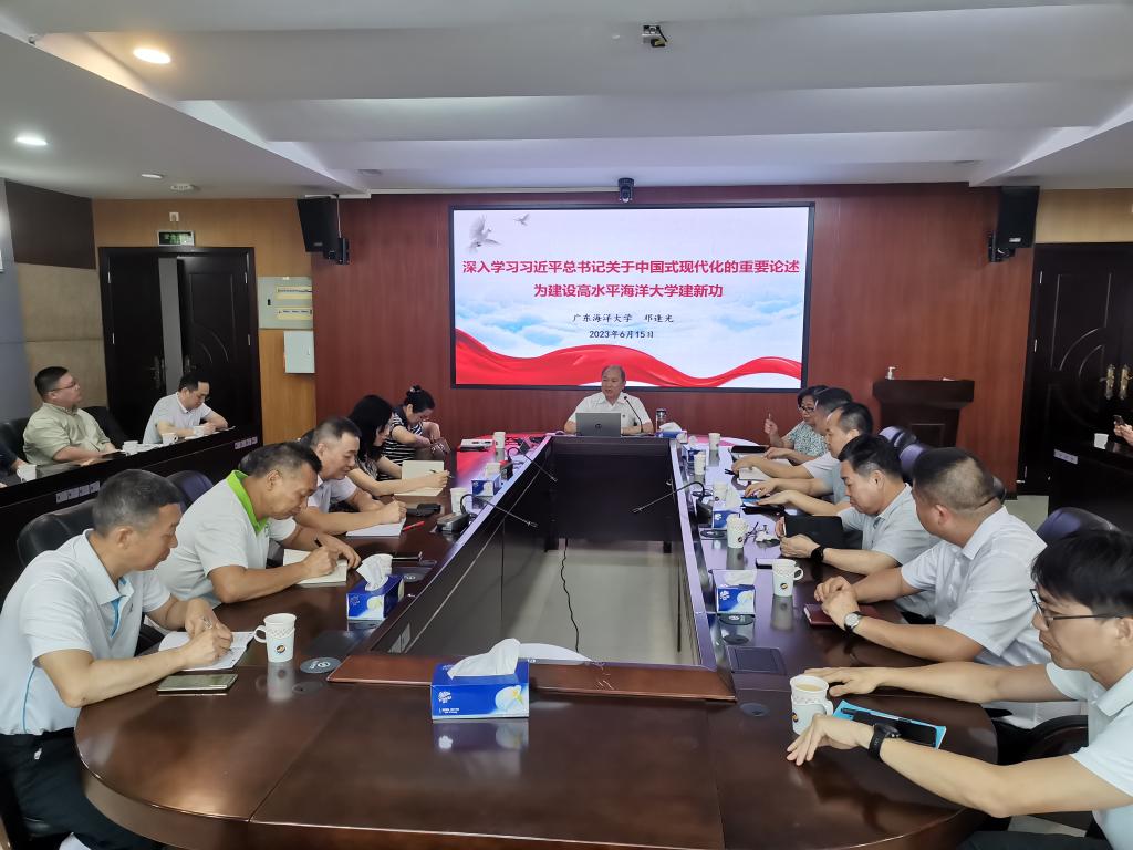 根据学校主题教育实施方案的总体安排,6月15日下午,学校党委常委、副校长邓逢光以“深入学习习近平总书记关于中国式现代化的重要论述,为建设高水平海洋大学建新功”为题讲授专题党课。学校保卫部(武装部)、财务部、基础建设部、后勤保障部、数学与计算机学院、外国语学院、中歌艺术学院、体育与休闲学院处级领导干部及基建处党支部全体党员参加了专题党课。