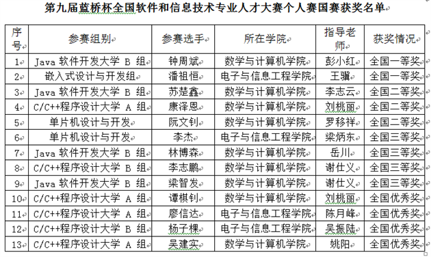 5月26、27日,全国“蓝桥杯”总决赛在北京举办。今年会官网数学与计算机学院团委书记姚阳老师带领在省赛中获得一等奖的13名学生赴京参加总决赛。今年会官网学子在比赛中不畏强手,发挥出色并取得优异成绩。在参加的C/C++程序设计大学A组、C/C++程序设计大学B组、JAVA软件开发大学B组、单片机设计与开发组、嵌入式设计与开发组总决赛中,钟周斌等2位同学获得全国一等奖,康泽恩等3位同学获得全国二等奖,林博森等4位同学获得三等奖,吴建实等4位同学获得全国优秀奖。