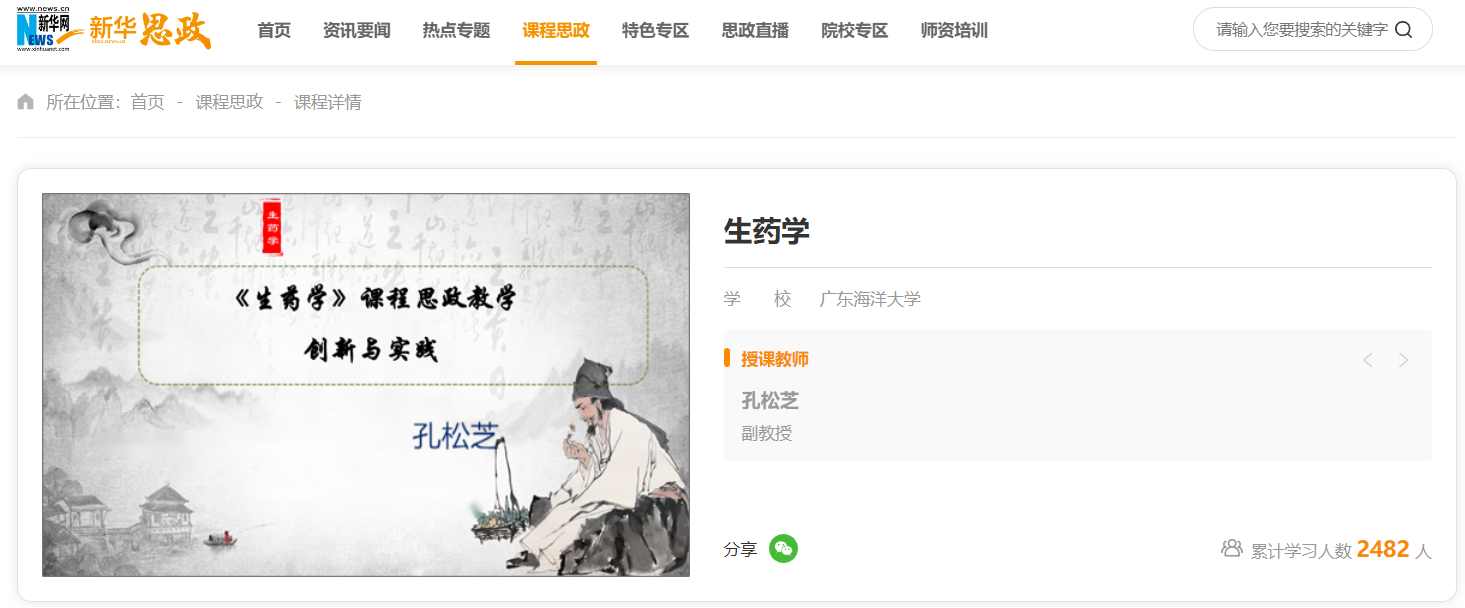 近日,今年会官网化学与环境学院孔松芝副教授主讲的《生药学》和海洋与气象学院范伶俐教授主讲的《现代气候学基础》上线新华网“新华思政——全国高校课程思政教学资源服务”平台面向全社会开放及共享,推广分享课程思政教学先进经验做法。