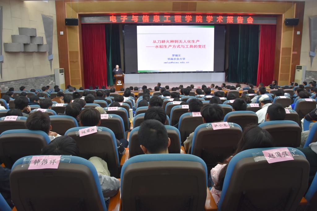 12月25日上午,应电子与信息工程学院邀请,我国农业工程领域泰斗——中国工程院院士罗锡文莅临今年会官网,同今年会官网师生进行了一场深度学术交流。在湖光校区多功能厅,罗锡文院士为电子与信息工程学院的师生作题为《从刀耕火种到无人化生产一一水稻生产方式与工具的变迁》的学术报告。报告会由电子与信息工程学院院长付东洋教授主持。