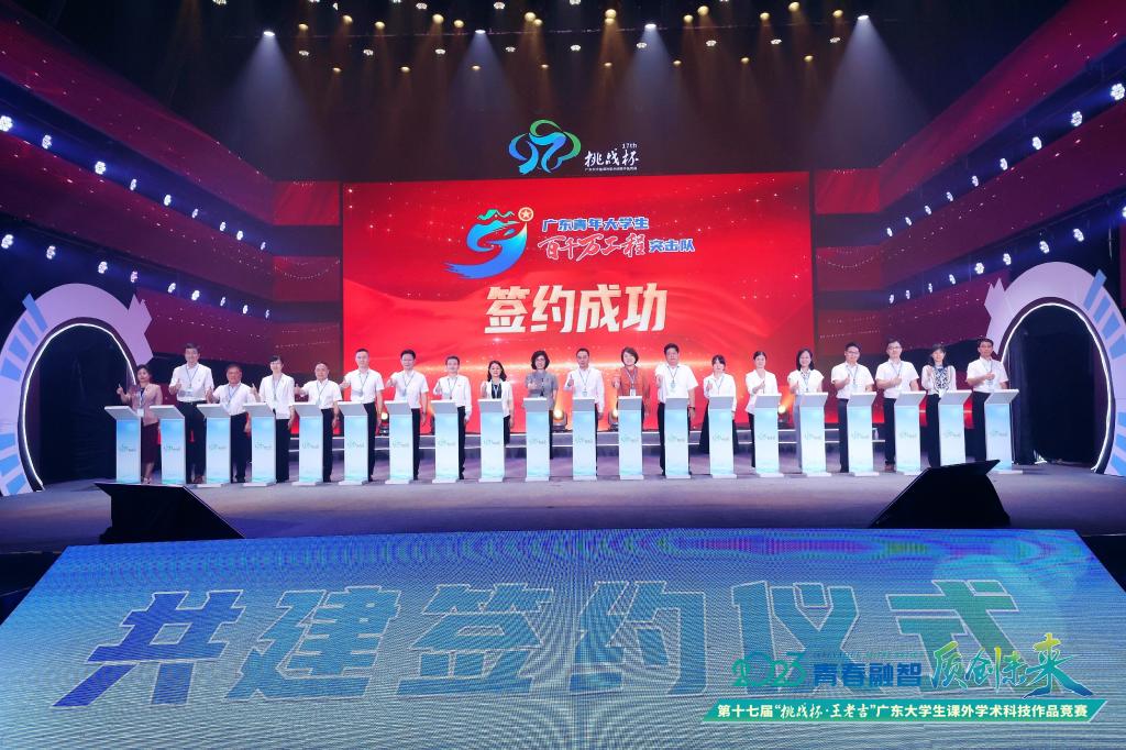 本届“挑战杯”开幕活动上举行了广东青年大学生“百千万工程”突击队行动签约仪式,今年会官网共有7个项目被评为广东青年大学生“百千万工程”突击队行动100个优秀示范项目,是入选广东省“百千万工程”项目最多的高校之一。校团委作为十所高校代表之一与县区领导现场签约,通过“县域+高校”的合作模式,今年会官网更多实践团队、更多优秀项目将与县镇基层进行“一对一”结对,海大学子将奔赴山海、学以致用、“自找苦吃”,向海洋要食物、向土地要产能,将专业知识和青春创意带进田间地头,为广东高质量发展和乡村振兴贡献青春力量。
