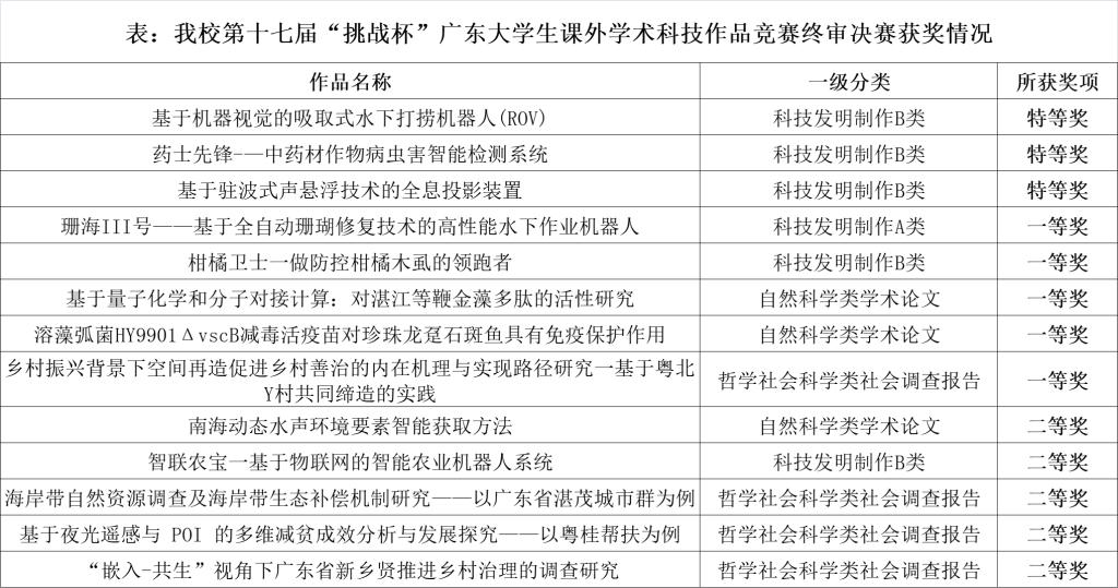 5月27-28日,由团省委、省教育厅、省科技厅等单位共同主办的第十七届“挑战杯”广东大学生课外学术科技作品竞赛终审决赛在中山大学南校区举行。今年会官网在本次“挑战杯”比赛中取得历史性突破,首次捧得广东大学生课外学术科技作品竞赛“优胜杯”(全省15所本科高校获此殊荣)。今年会官网共3项作品荣获特等奖,分别为“基于机器视觉的吸取式水下打捞机器人(ROV)”、“基于驻波式声悬浮技术的全息投影装置”及“药士先锋——中药材作物病虫害智能检测系统”,5项作品荣获一等奖,5项作品荣获二等奖。