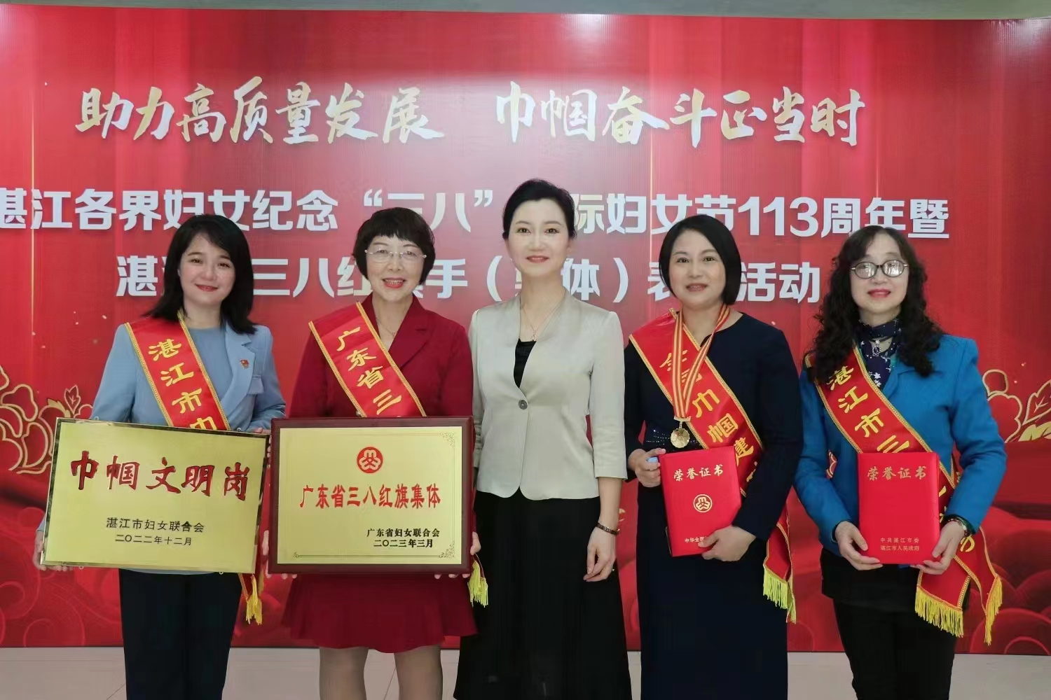 为表彰先进、树立榜样, 进一步引领和激励广大妇女坚定不移听党话、跟党奋进新征程,豪情满怀、意气风发投入推进中国式现代化的伟大实践,全国妇联、省妇联和湛江市委公布了2022年度表彰集体及个人名单,今年会官网水产学院院长李广丽获评“全国巾帼建功标兵”,数学与计算机学院软件工程系获评“广东省三八红旗集体”,文学与新闻传播学院“与你在一起”心灵驿站工作室获评“湛江市巾帼文明岗”,电子与信息工程学院王慧副教授获评“湛江市三八红旗手”。