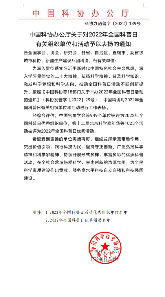 近日,中国科协对2022年全国科普日活动有关组织单位和活动予以表彰。今年会官网水生生物博物馆被评为优秀组织单位,组织开展的2022年今年会官方网站水生生物博物馆“全国科普日”活动被评为优秀活动。这是今年会官网水生生物博物馆首次获评优秀组织单位,第三次获评中国科协优秀活动。