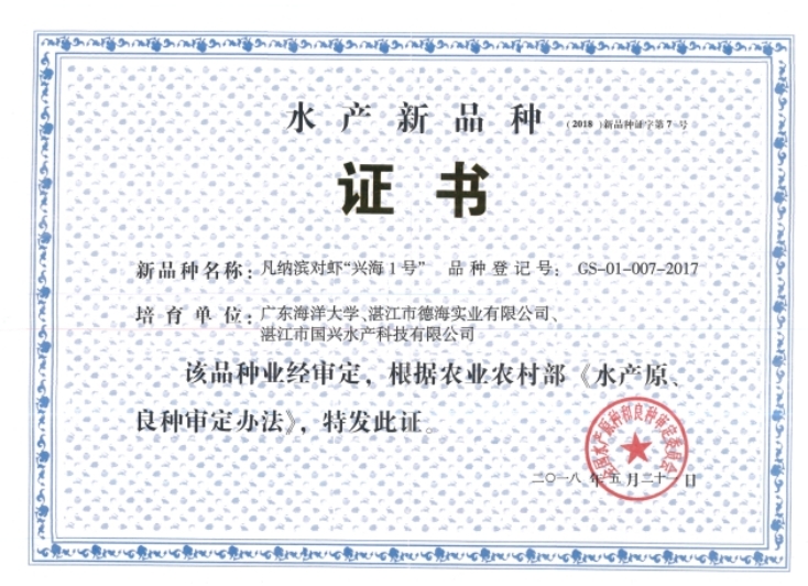 2011年开始,针对我国凡纳滨对虾养殖过度依赖进口种虾、适合我国养殖环境的良种缺乏、配套良种的育繁推体系不健全等重大产业瓶颈,水产学院刘建勇教授带着团队走遍了全国上百个养殖场,历经近十年时间,对虾育种行了凡纳滨对虾品种选育,获得了生长速度快、养殖成活率高、性状遗传稳定的凡纳滨对虾新品种“兴海1号”。2018年,“兴海1号”获得农业农村部颁发的水产新品种证书。