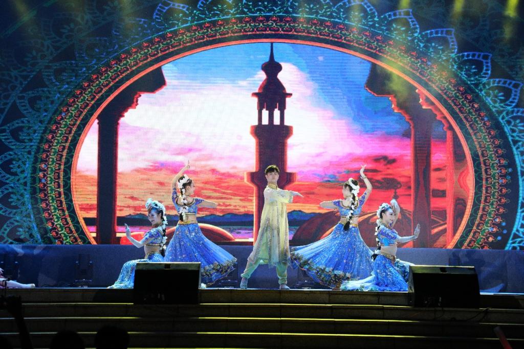 演出在一支欢快婀娜的印度舞蹈《欢乐的黛娃达茜》中开场。排箫、口笛演奏《山鹰》《云雀》为观众送来遥远印第安部落的“天籁之声”,舞蹈《敏阿拉巴》把观众带入缅甸宫廷舞蹈的美感和意蕴。热情洋溢的西班牙舞蹈《火热的飞裙》、俄罗斯歌舞《夜莺》和极富异域风情的埃及舞蹈《幻沙魅惑》进一步引燃观众的热情。徐美茜、西尔艾力等男女高音歌唱家演唱的《花儿为什么这样红》《哦,我亲爱的爸爸》等经典曲目让观众在爱情的咏叹中沉浸。最后,曾经登上春晚舞台的舞蹈《丝路霓裳》以强大的演出阵容、精美绝伦的服饰惊艳展现“丝绸之路”沿线各个民族和国家的风土人情,在观众的惊叹声中把晚会推向高潮。