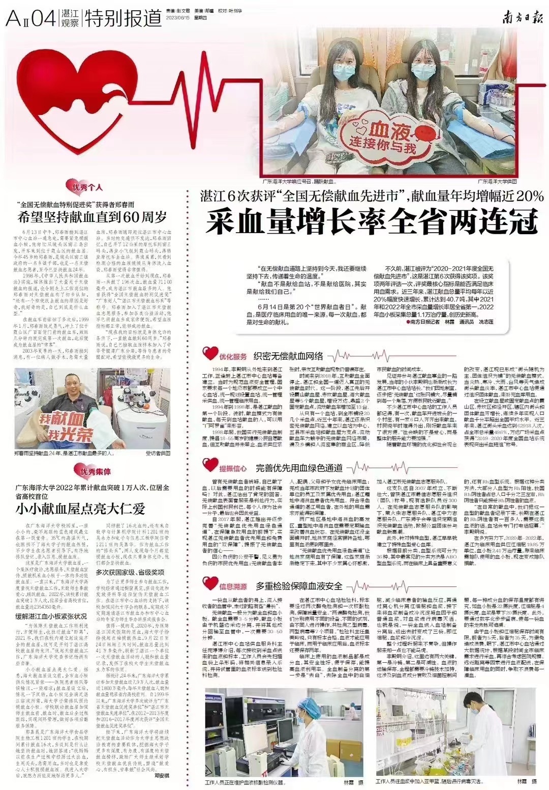 6月15日,南方日报IC04版刊登报道《小小献血屋点亮大仁爱》,对今年会官网一直以来把无偿献血活动作为大学生思想政治教育的重要载体,海大师生奉献爱心、踊跃献血的先进事迹作了报道。学校党委书记杨洲接受了南方日报采访,表示将继续挖掘海大学子更多有深度、有力度、有温度的无偿献血榜样,激励广大师生继承好学校无偿献血优良传统,塑造“献爱心、有担当、甘奉献”社会风尚。