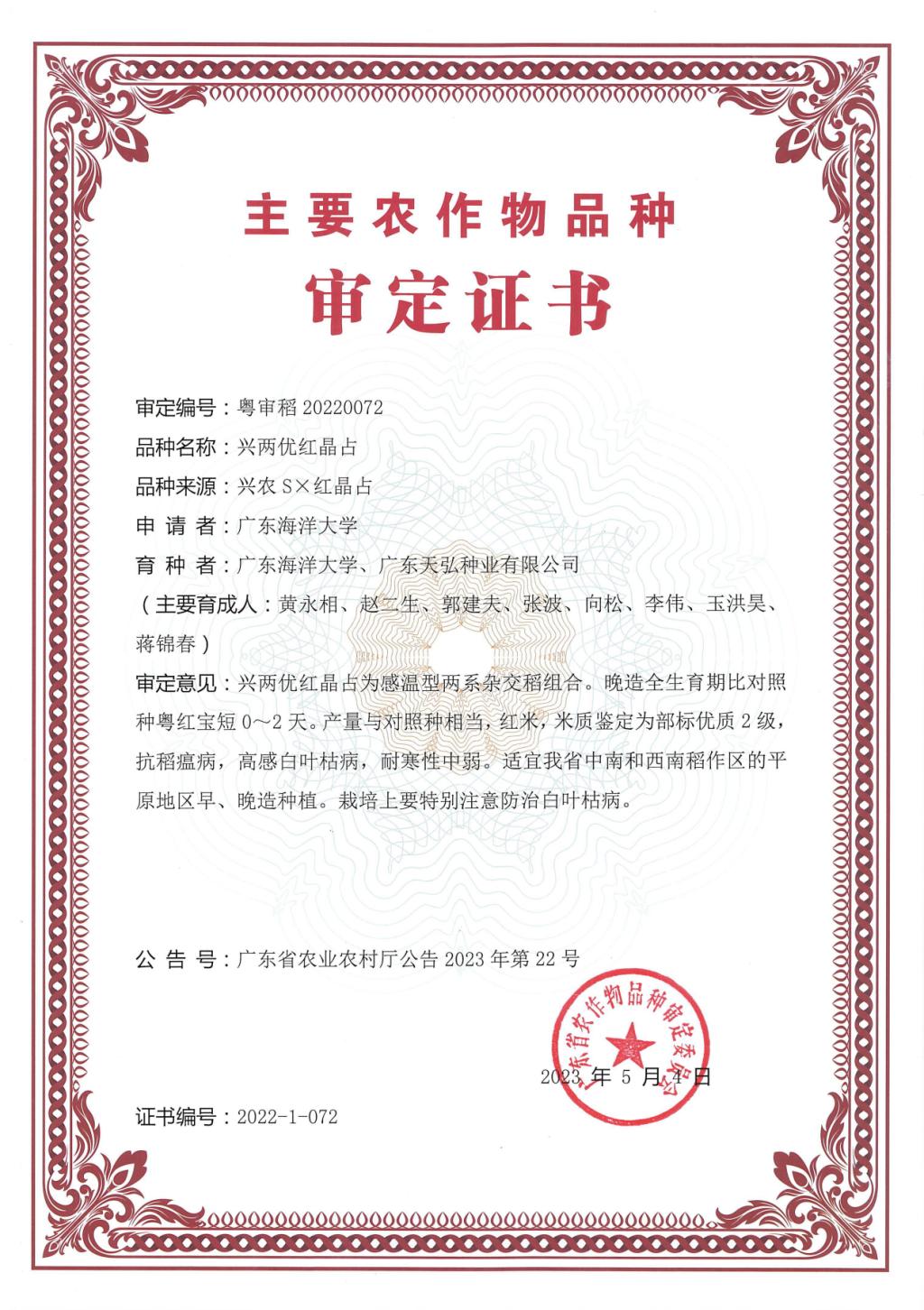 近日,从广东省农业农村厅的《关于广东省2022年度农作物品种审定通过品种的公告》获悉,今年会官网郭建夫研究员、黄永相副教授课题组育成的特种稻新品种“兴两优红晶占”通过了我省农作物品种审定(审定编号:粤审稻20220072)。“兴两优红晶占”糙米棕红色,米质达部颁二等优质食用稻品种品质标准,稻米香气物质2-乙酷-1-呲咯啉(2-AP)含量达146.85μg/kg,属于红香型优质杂交籼稻新品种。