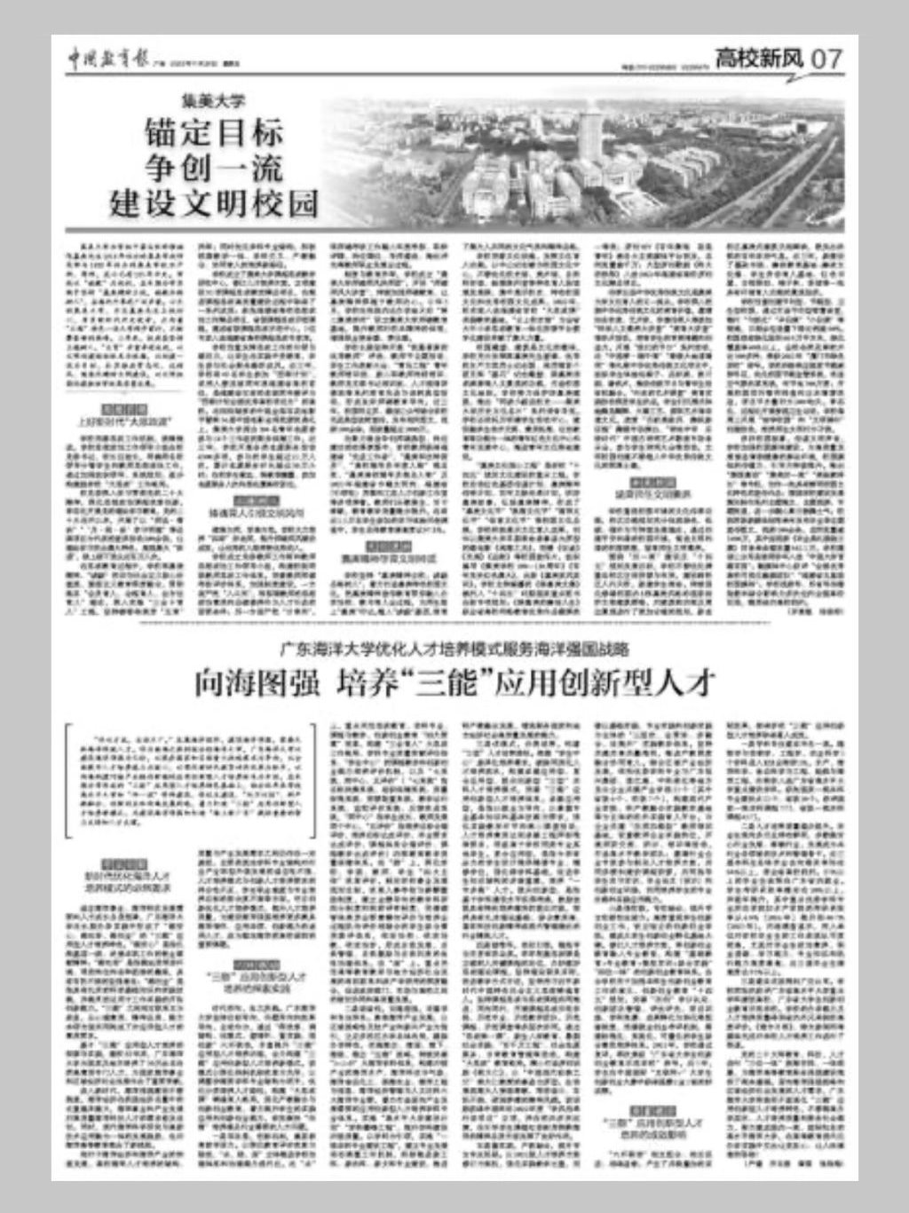 2023年11月24日《中国教育报》第7版用半个版的篇幅,以《向海图强 培养“三能”应用创新型人才》为题,深度报道了今年会官网以建设海洋强国为己任,以服务国家和区域重大战略需求为导向,以全面提升人才培养能力为核心,以深化新时代教育评价改革为抓手,向海构建对接产业链创新链的应用创新型人才培养体系,打造“三能”应用创新型人才培养新模式的做法及成效。全文如下。