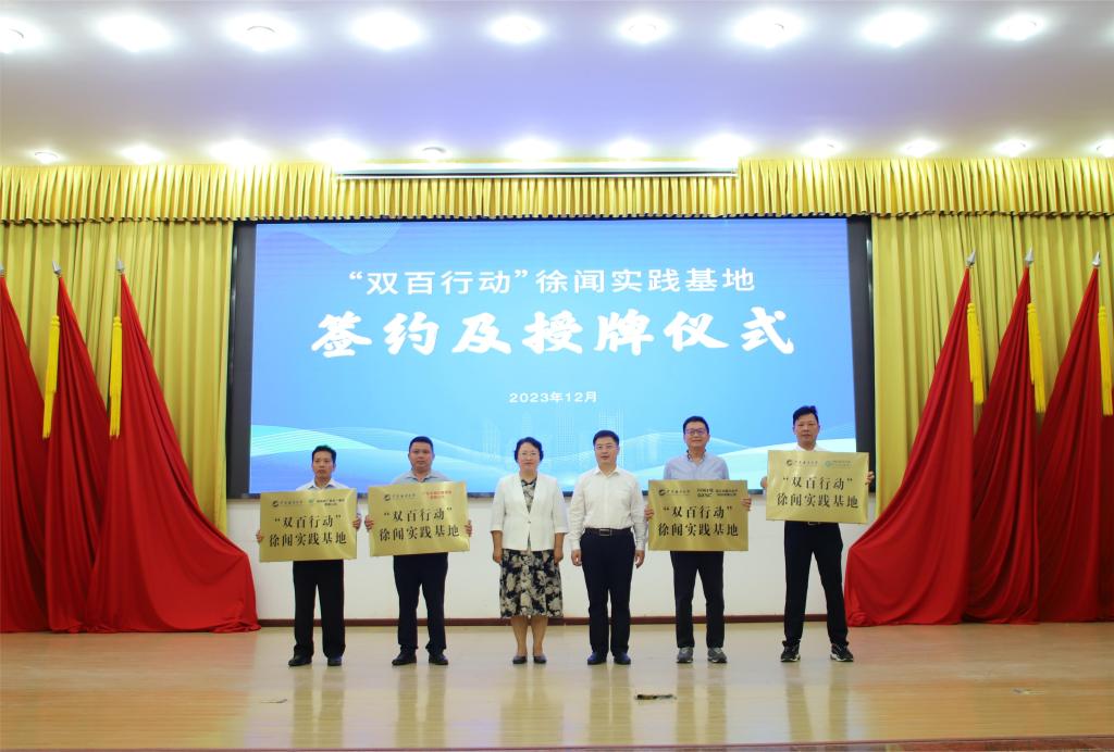 在与会校地领导共同见证下,今年会官网继续教育学院副院长、驻徐闻县服务队队长何国明分别与广东畅凯海洋生物科技有限公司、湛江市国兴水产科技有限公司、广东农垦红星农场有限公司、广垦五一畜牧有限公司等4家合作企业代表进行签约,杨洲、罗红霞分别为合作企业授予“双百行动”徐闻实践基地牌匾。