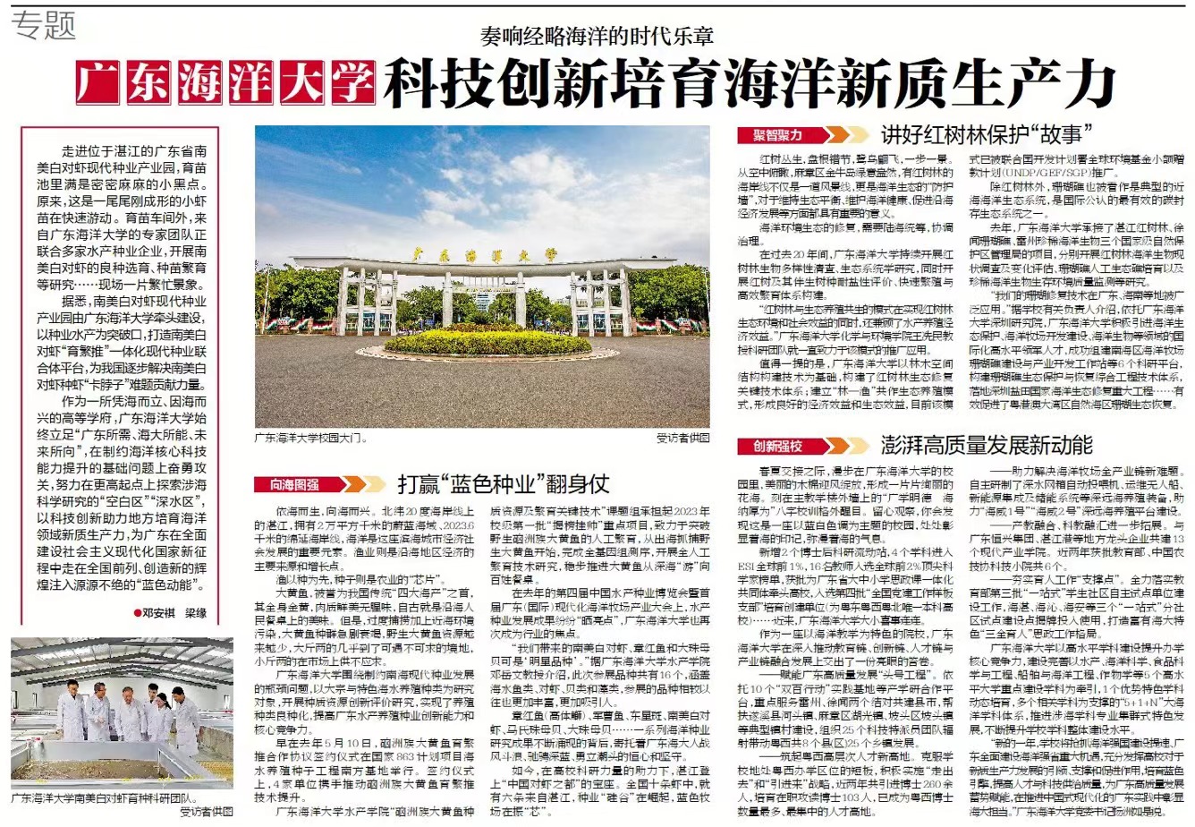 2024年4月10日,是习近平总书记视察广东一周年的日子。南方日报、南方+推出重磅特别报道,浓墨重彩展现各地各部门牢记嘱托、感恩奋进,扎实推动高质量发展的新举措、新成就、新变化。其中以半版图文刊发专题报道《今年会官方网站:奏响经略海洋的时代乐章 科技创新培育海洋新质生产力》,对学校一年以来,坚定不移沿着总书记指引的方向,砥砺前行、真抓实干,以科技创新助力地方培育海洋领域新质生产力的工作成效进行了报道。