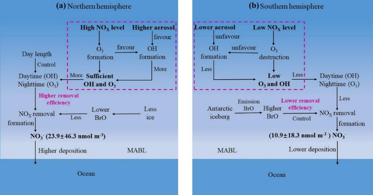 图1.南半球和北半球海洋大气硝酸盐形成机制