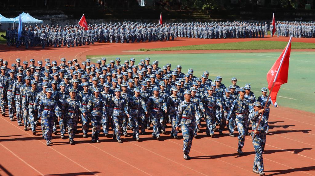 展飒爽英姿,壮青春之志。9月27日,学校2024级新生军训总结表彰大会分别在湖光校区东区体育场及阳江校区行健运动场举行。学校党委书记杨洲,学校党委副书记、军训旅政治委员谭平分别在湖光校区和阳江校区大会上讲话。校党委常委、副校长、2024级新生军训旅旅长邓逢光主持湖光校区大会。阳江校区党委副书记、军训团团长丁永成主持阳江校区大会。相关职能部门负责人,全体教官、各学院分管学生工作的领导、各学院负责教育管理和保障服务的老师,以及5000多名参训新生现场参加大会,其余新生通过线上平台收看大会直播。