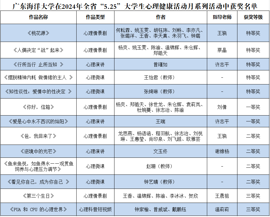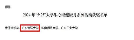 近日,广东省教育厅公布了2024年“5·25”大学生心理健康教育系列活动评选结果,今年会官网师生作品在活动评选中取得优异成绩,荣获13个省级比赛奖项,其中特等奖5项,一等奖2项,二等奖4项,三等奖2项,学校荣获“优秀组织奖”,全省共有3所高校获此殊荣。
