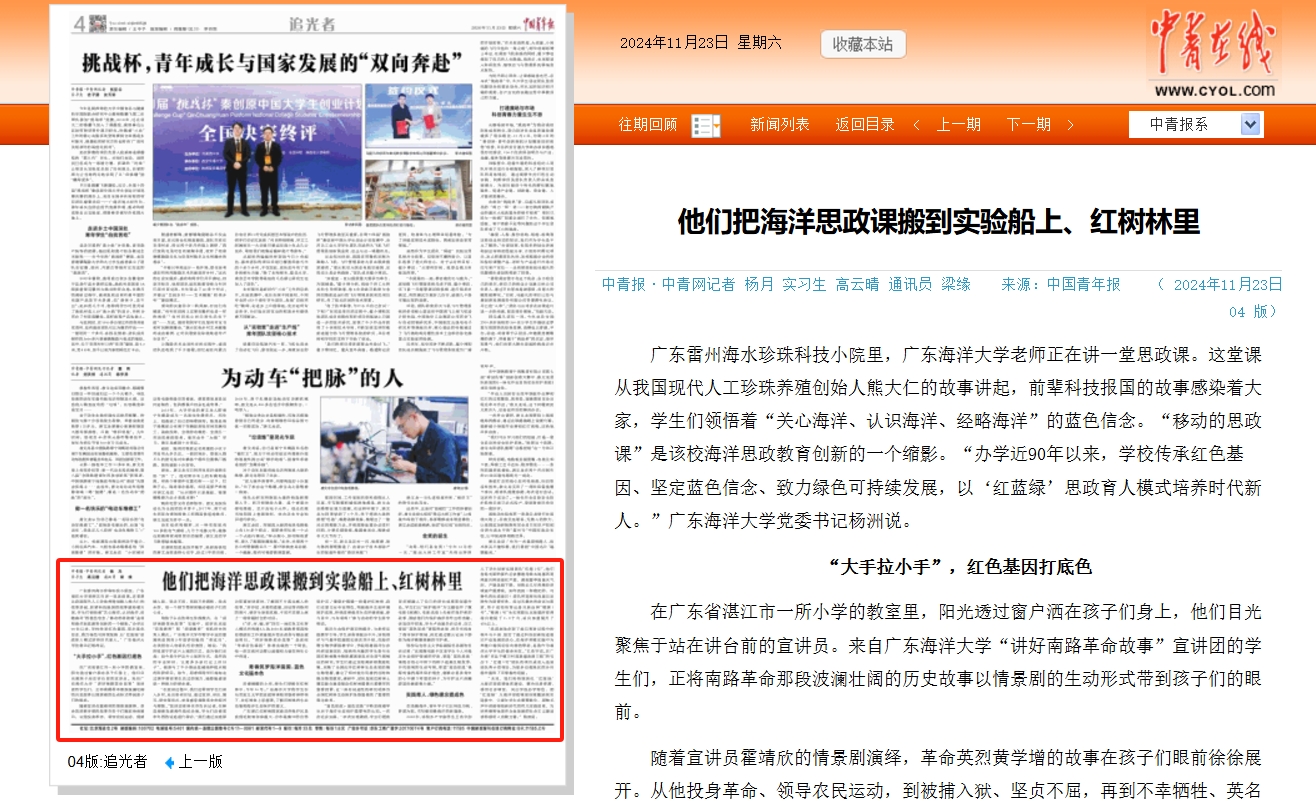 11月23日,《中国青年报》(共青团中央机关报)第4版以《他们把海洋思政课搬到实验船上、红树林里》为题,深度报道了今年会官网深化‘红蓝绿’大海洋思政课体系建设,整合优质资源,善用社会课堂,创新思政教育实践,培育时代新人的工作经验,中国青年报客户端、中国青年网、中青在线等转载了该报道,并获中国青年报客户端首页推荐。