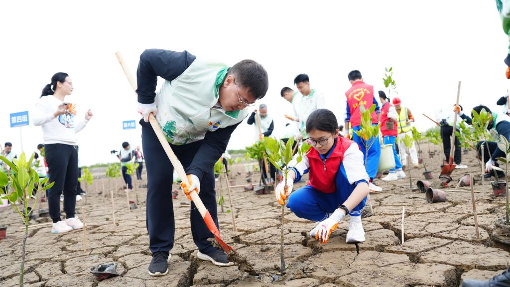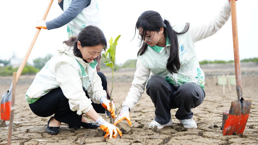 在红树林保护区“6号塘”植树区域,师生与企业员工紧密配合、挥锹培土、扶苗浇水,完成了200株红树林树苗的精准栽种,在滩涂上开辟出一条条种植带。作为湛江城发集团今年开展红树林保护区修复的重点区域,这片水域面积478亩的“6号塘”植树区域,在校企携手植树中,被描绘出一幅牢记嘱托、践行“绿美广东”生态建设的生动画卷。