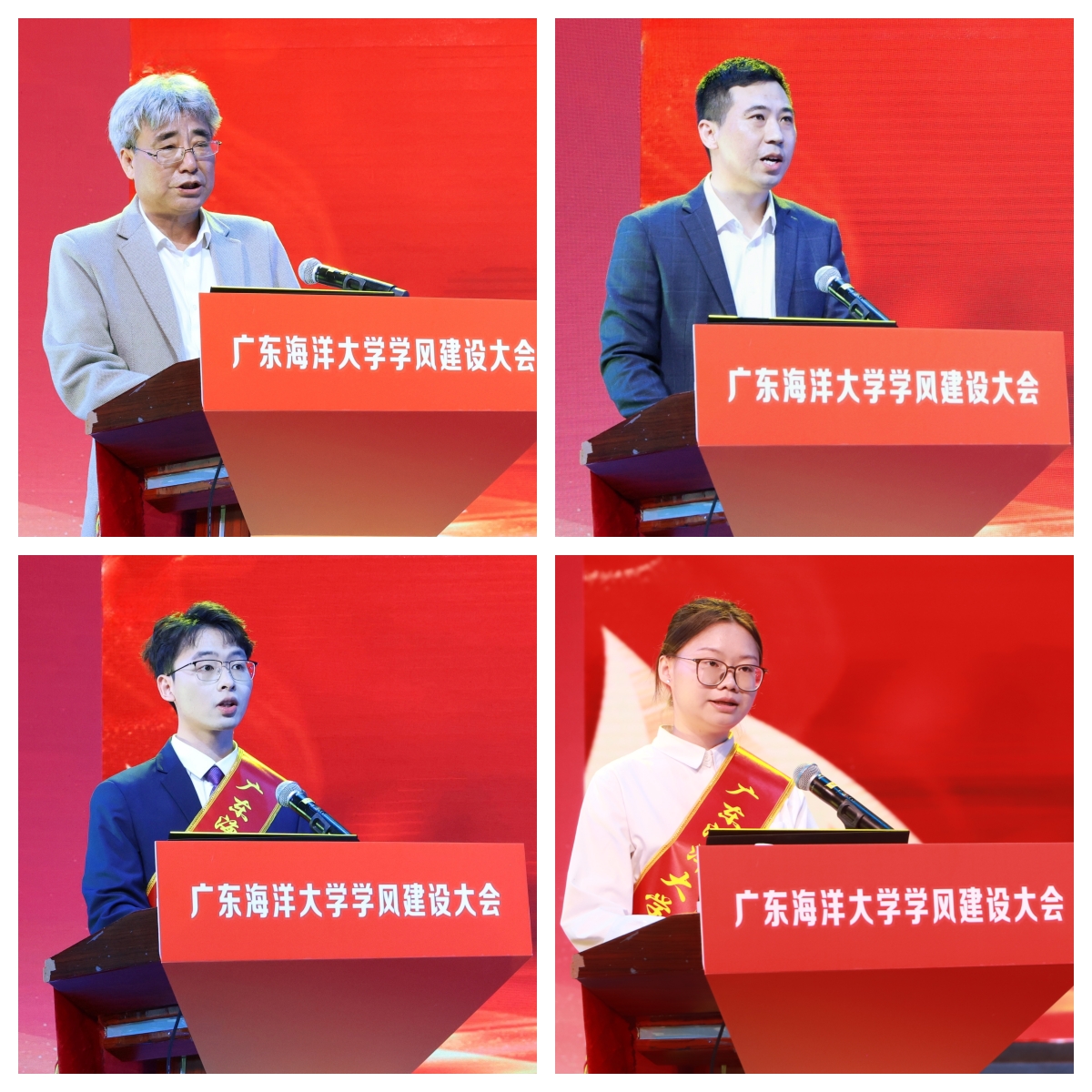 教师代表滨海农业学院赵志辉教授、辅导员代表水产学院朱晓闻老师分别从师德师风、以教风带学风、辅导员的职责使命、学风建设举措等方面交流了经验和感悟。校十佳大学生代表化学与环境学院叶鸿杰、校十佳班集体代表数学与计算机学院何芯仪分别从个人成长经验、学风传承、班集体学风建设谈起,分享了自己对优良学风的理解与感受。