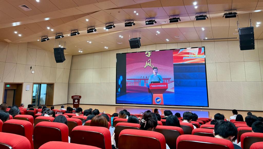 3月25日,学校在湖光校区中歌艺术学院实验剧场召开学风建设大会。学校党委书记杨洲出席会议并讲话,学校党委副书记谭平主持会议,学校党委常委、副校长邓逢光、鲁义善,党委常委、宣传统战部部长林宇,相关职能部门主要负责人,各学院领导、系主任,全体辅导员,教师和学生代表共400余人参加现场会议,阳江校区师生线上直播参会。