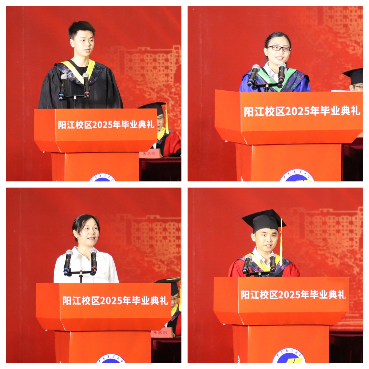校区党委副书记丁永成宣读了2025届本科生及研究生毕业生情况,校区党委副书记麦冬宁宣读了优秀毕业生表彰决定,阳江市副市长柯燕为考研学生代表颁奖,华南理工大学帮扶队原队长、佛山大学副校长曾新安为优秀本科毕业生代表颁奖。杨洲为校友联络员代表颁发了聘书。