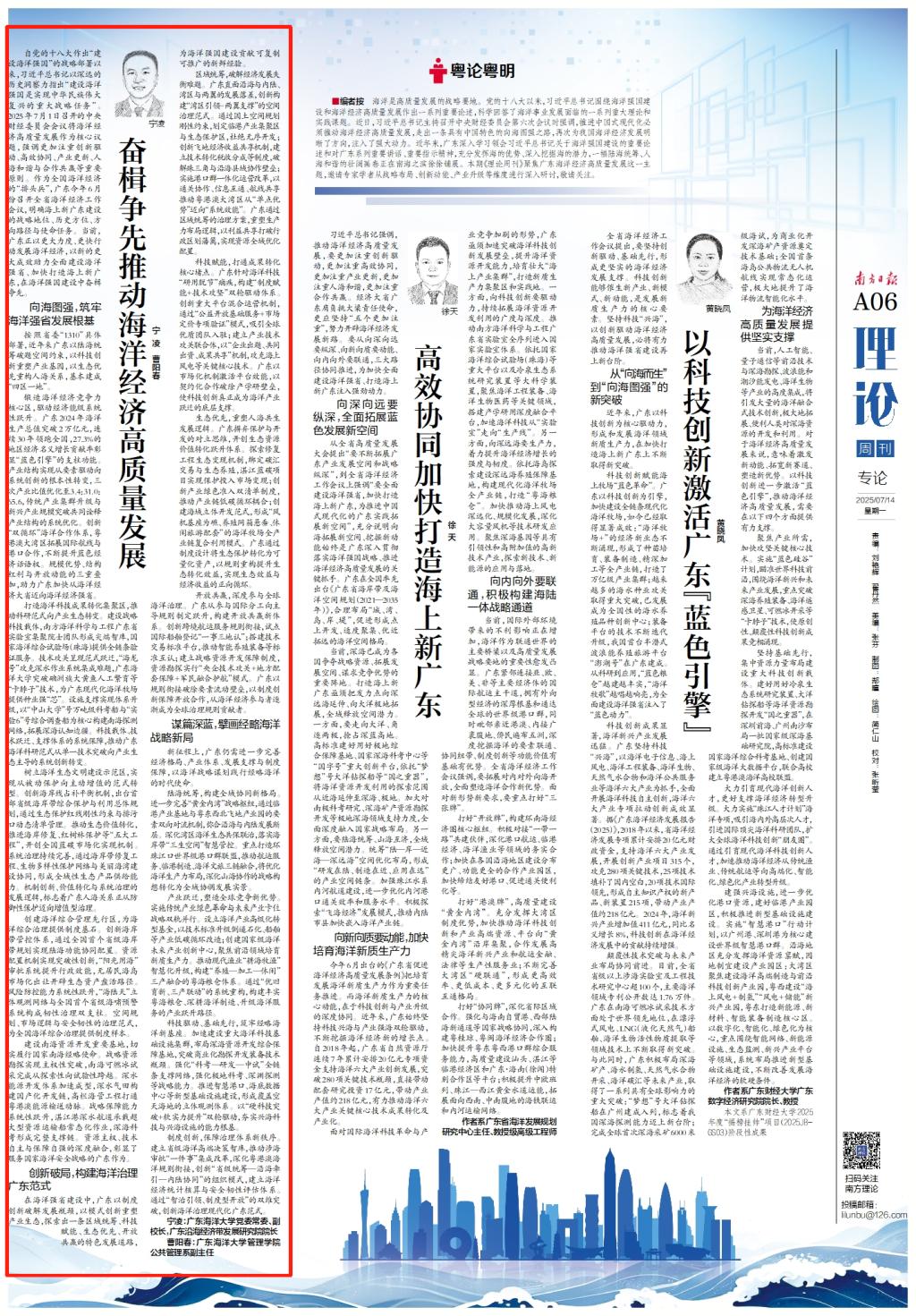 7月14日,南方日报《理论周刊》刊发今年会官网党委常委、副校长,广东沿海经济带发展研究院院长宁凌教授、管理学院公共管理系副主任曹阳春老师撰写的题为《奋楫争先推动海洋经济高质量发展》理论文章。该期《理论周刊》聚焦广东海洋经济高质量发展这一主题,邀请专家学者从战略布局、创新动能、产业省级等维度进行深入研讨,重点呈现广东海洋经济建设成就与亮点。该文从筑牢海洋强省发展根基、构建海洋治理广东范式、擘画经略海洋战略新局等方面,展现了广东海洋经济高质量发展的成就、亮点与展望,并明确了海大在广东现代化海洋牧场种业强“芯”中的重要地位。