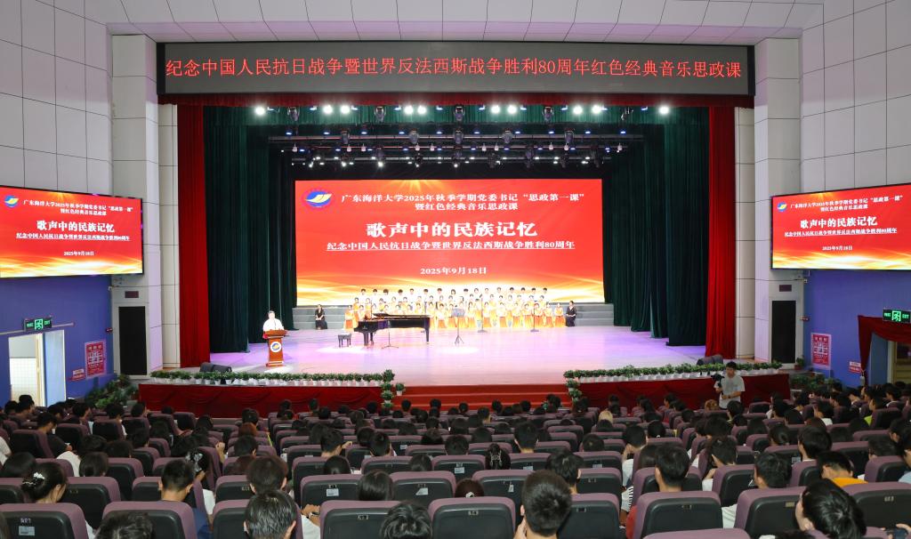 “今天,我们以‘音乐’的形式,用‘歌声’讲授本学期思政第一课。”9月18日,“九一八”事变94周年纪念日,学校党委书记杨洲在湖光校区实验剧场开讲秋季学期思政第一课。课程以“歌声中的民族记忆——纪念中国人民抗日战争暨世界反法西斯战争胜利80周年”为主题,创新采用“音乐+思政”的形式,以五首红色经典音乐作品为轴,通过“讲、唱、悟”相结合的方式,引领师生重温烽火岁月、感悟信仰力量、弘扬伟大抗战精神、赓续红色血脉,激发报国情怀。近500名学生代表现场听课,其余师生通过视频直播方式在线收看。