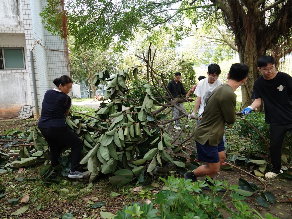 校领导杨洲、邓逢光、鲁义善实地检查了校园各处的灾后重建情况,对树木倒伏严重、积水隐患突出的重点区域进行现场指导,提出了科学高效的清理要求。校领导们还加入到师生队伍中,与大家一同搬运断枝、清扫落叶、清理积水。