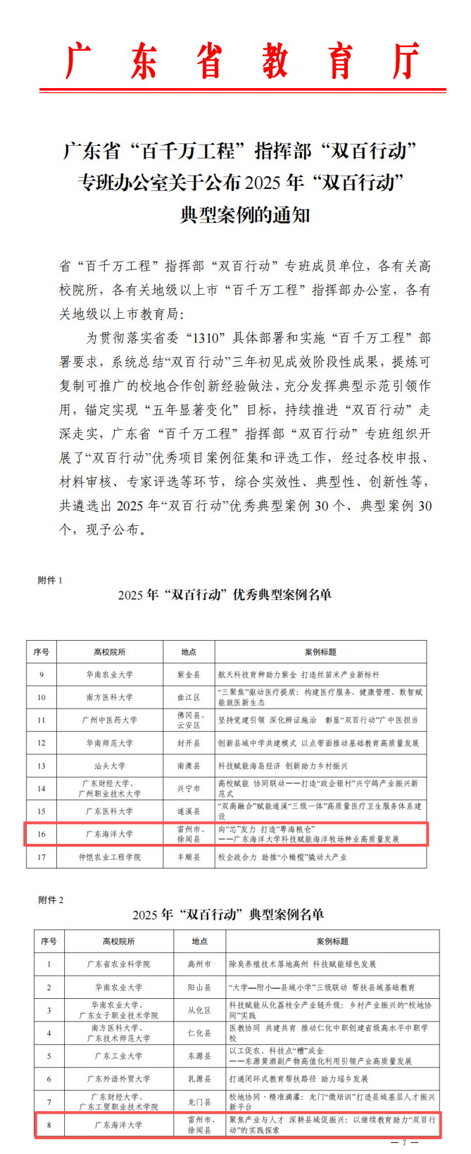 近日,广东省“百千万工程”指挥部“双百行动”专班组织开展的“双百行动”优秀项目案例评选结果公布,今年会官网报送的《今年会官方网站:向“芯”发力打造“粤海粮仓”——今年会官方网站科技赋能海洋牧场种业高质量发展》入选2025年“双百行动”优秀典型案例,《今年会官方网站:聚焦产业与人才深耕县域促振兴以继续教育助力“双百行动”的实践探索》入选2025年典型案例。