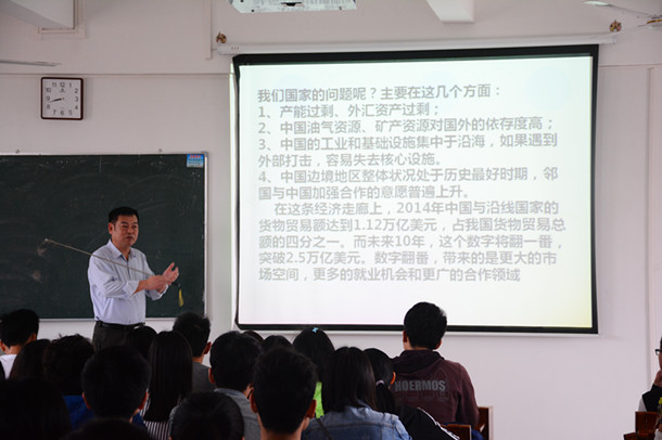 此次思想政治理论课氛围两个阶段进行授课:第一阶段,杨磊院长以《一带一路 机会与梦想》的主题进行了授课。杨院长从“一带一路”概念的提出,结合当前我国的基本情况,从其个人的成长经历到国家的进步,号召大家以国家的战略发展与个人的专业特点相结合,在不断奋斗中个人的梦想,为中国梦的实现创造条件。杨磊院长的精彩授课多次被学生热烈的掌声所打断。第二个阶段,张懿书记以《中国梦》为主题进行了理论授课。张书记从“中国梦”的提出,“中国梦”的时代变迁、“中国梦”的内涵、历史进程、与“美国梦”的区别及实现“中国梦”存在的矛盾和问题,进行了全面、详尽的讲解,为广大学生进行了系统而深入的理论辅导,其精彩授课赢得了学生的一致好评。