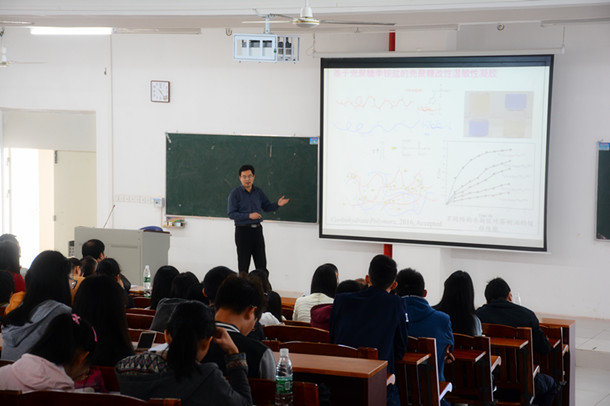 报告会上,杨卓鸿教授首先讲述了系列热带植物精油的功效及其微胶囊化技术,接着杨卓鸿教授着重介绍了植物油光化学反应特性及其在环保油漆方面的应用研究,并对国际国内现状进行了深刻的分析。随后,陈煜教授对壳聚糖改性抗菌剂和止血剂的开发及产业化、壳聚糖基功能水凝胶的制备和壳聚糖的定位接枝改性进行了深入的阐述。专家们对师生的提问给予精彩的解答,并希望同学们积极报考华南农业大学和北京理工大学的硕士和博士生。