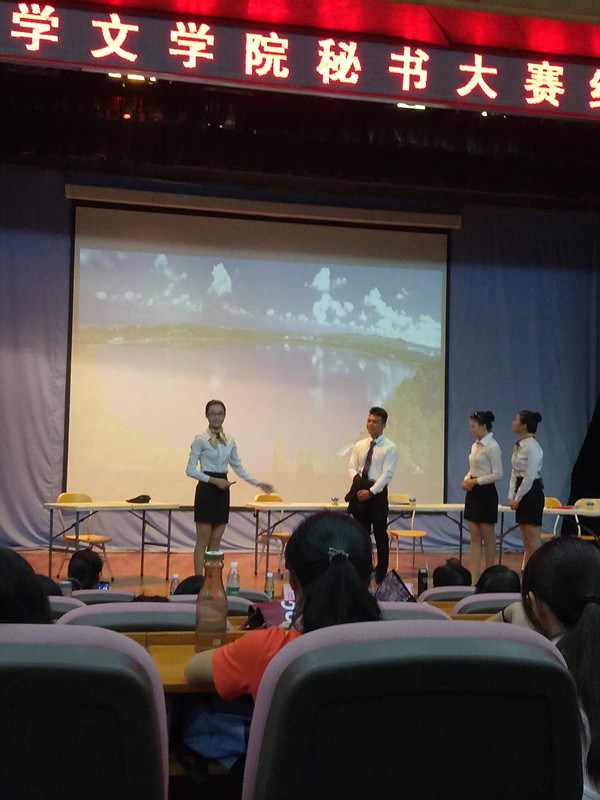 接着,由获得第六届全国商务秘书职业技能大赛团体奖一等奖的秘书专业学生何璟、梁佳焰、苏虹漫、聂启金四位同学作了关于会议筹备及会务工作相关的秘书实务进行了场景模拟展示;在第四届广东省秘书职业技能大赛获得“秘书工作情景展示”一等奖的周叶欣、廖子惠、赵昕、邱钊城四位同学的展示内容则是秘书该如何处理多头领导与日常事务等情况。情景展示结束之后八位获奖同学依次上台与大家分享了他们在赛前培训以及赛中表现的一些经验与心得。