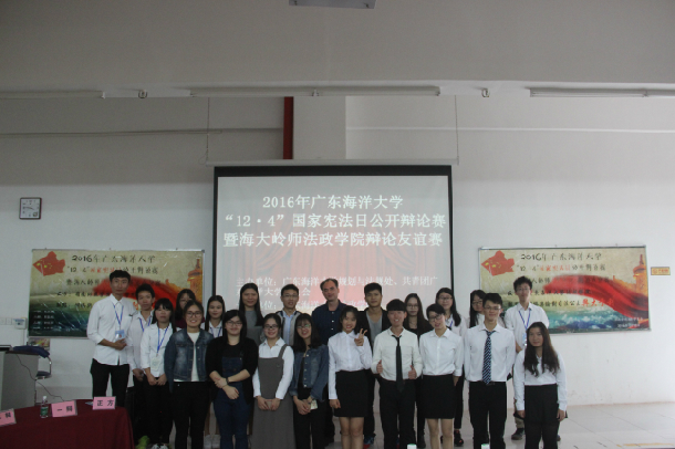 12月10日, 由学校学规划与法规处、校团委主办,法政学院承办,岭南师范学院法政学院协办的今年会官方网站“12· 4”国家宪法日公开辩论赛暨海大岭师法政学院辩论友谊赛在湖光校区第二教学楼举行,出席嘉宾有规划与法规处副处长吴汉华老师,法政学院团委书记郭唐梨老师,法政学院团委学生会代表。