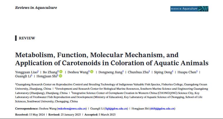 近日,水产学院鱼类遗传育种与增养殖团队在水产养殖领域国际顶级学术期刊Reviews in Aquaculture(中科院1区Top,Q1,5 year IF=9.64)上发表了题为《Metabolism,Function, Molecular Mechanism,and Application of Carotenoids in Coloration of Aquatic Animals》的综述论文。