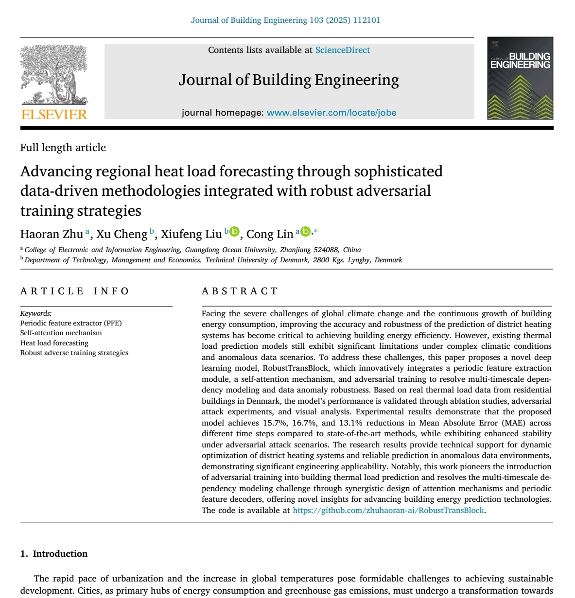 近日,电子与信息工程学院本科生创新团队——海洋信息智能化处理团队自动化1221级学生朱浩然在团队导师林聪、程徐和刘秀峰的指导下,以第一作者身份在国际高水平期刊Journal of Building Engineering(Q1,中科院二区,Top, IF=6.9)上发表了一篇题为《Advancing Regional Heat Load Forecasting through Sophisticated Data-Driven Methodologies Integrated with Robust Adversarial Training Strategies》的学术论文。文章提出了一种周期特征提取方法,并采用对抗攻击训练,增强了热负荷预测模型的性能和鲁棒性。