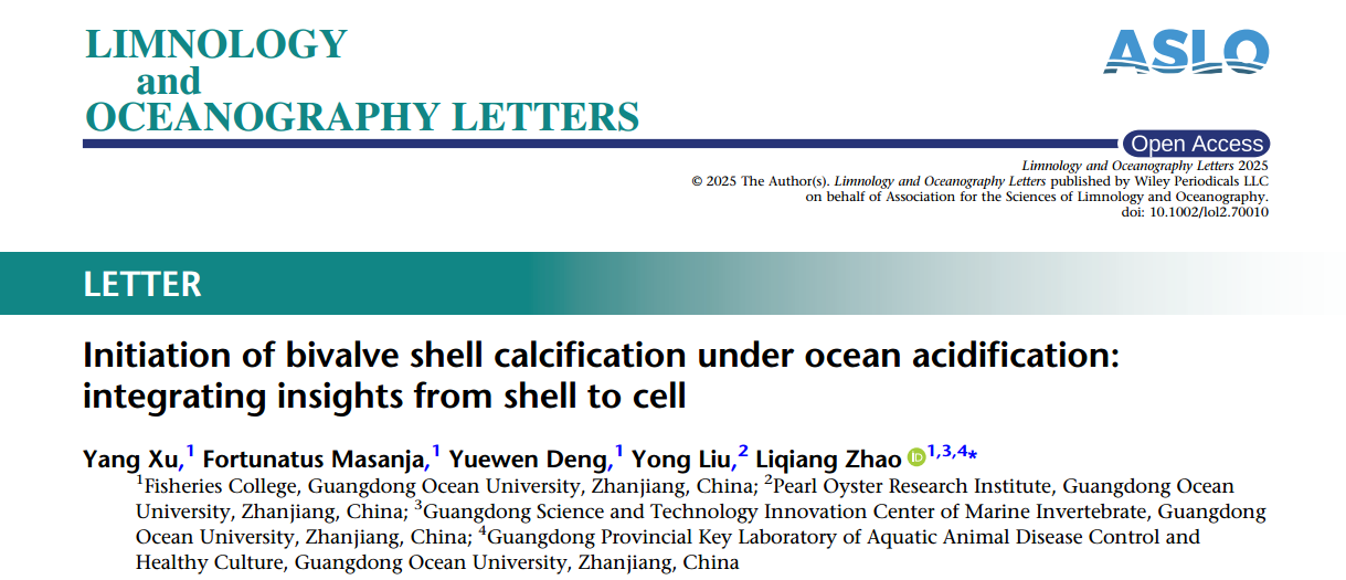 近日,水产学院贝类遗传育种与增养殖团队在海洋与湖沼领域顶级期刊《Limnology and Oceanography Letters》(中科院大类1区,IF=5.1)发表了题为《Initiation of bivalve shell calcification under ocean acidification: integrating insights from shell to cell》的研究论文。