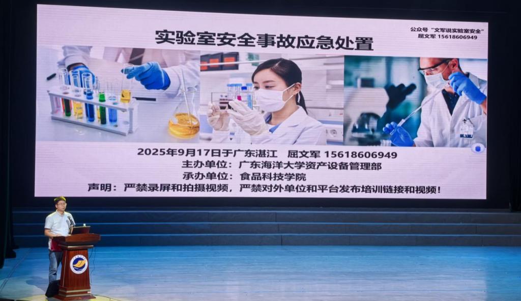 当日下午,学院在艺术学院小剧场召开了实验室安全培训会。资产设备管理部副部长杨少闻,以及食品科技学院全体研究生、实验教师、实验室管理员和研究生导师等共计200余人参加了会议。副院长高加龙强调,必须严格压实管理责任,持续加强安全培训与宣传教育。随后,屈文军老师作了题为《实验室安全事故应急处置》的专题讲座,结合大量实拍隐患图片,从应急处置流程、爆炸事故紧急避险、化学品灼伤与泄漏处置、火灾事故应对等多个方面进行了讲解。