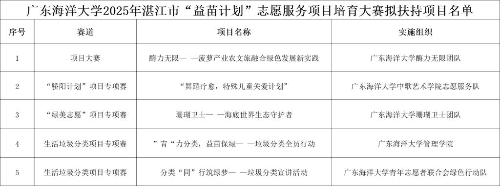 本次大赛由团湛江市委、市城管执法局、市委社会工作部联合主办,岭南师范学院承办,自今年8月启动以来,历经数月遴选与评审,最终确定35个市级扶持项目。今年会官网选送的项目凭借鲜明的海洋特色、扎实的实践基础和可持续的服务模式,赢得评审组高度认可。其中,《珊瑚卫士--南海海底护“林”先锋》项目聚焦绿美湛江建设,以珊瑚礁生态保护为核心开展志愿服务;《酶力无限--菠萝产业农文旅融合绿色发展新实践》等项目则紧扣“百千万工程”部署,将专业技术与乡村振兴需求深度结合,展现了海大学子立足地方、服务大局的责任担当。入选项目将获得资金支持、资源对接、专业督导等多维度培育扶持。