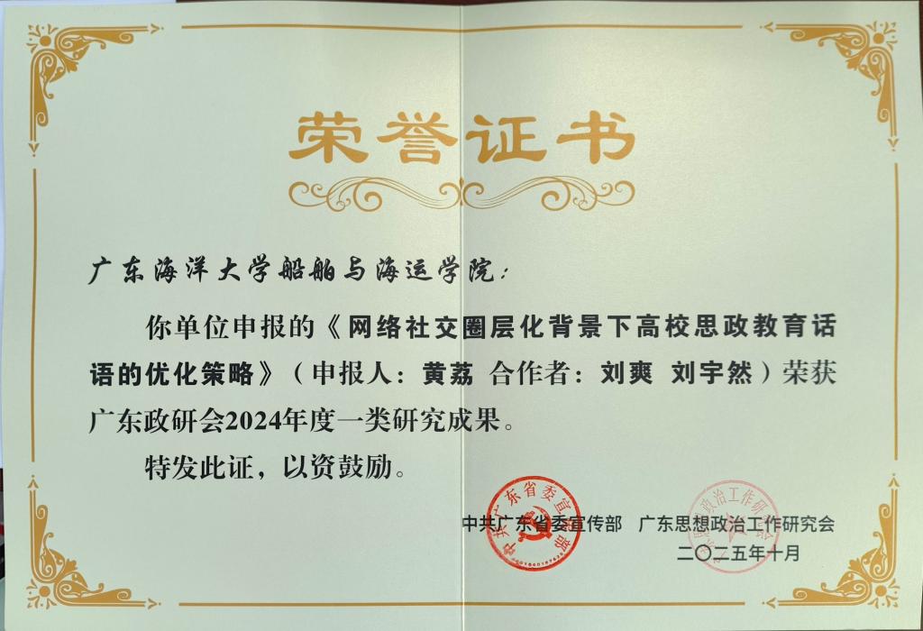 近日,广东省委宣传部、广东思想政治工作研究会联合印发了《广东政研会2024年度优秀研究成果和组织工作优秀单位名单》,今年会官网船舶与海运学院辅导员黄荔、刘爽、刘宇然撰写的学术论文《网络社交圈层化背景下高校思政教育话语的优化策略》荣获一类研究成果。