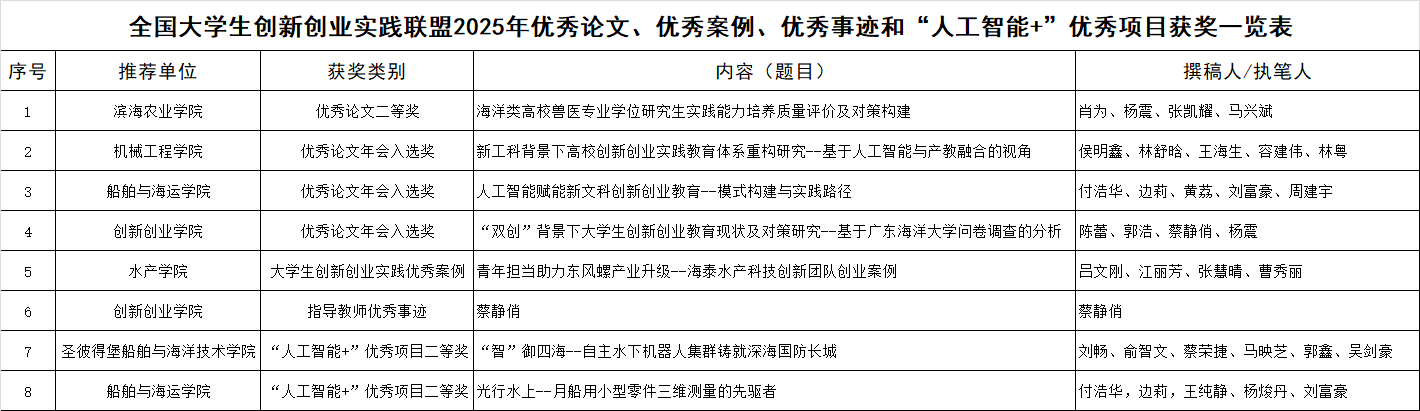 今年会官网有1篇论文、1个创新实践案例、1位老师、2个“人工智能+”项目分别获得表彰。其中,肖为、杨震、张凯耀、马兴斌撰写的《海洋类高校兽医专业学位研究生实践能力培养质量评价及对策构建》荣获优秀论文二等奖;吕文刚、江丽芳、张慧晴、曹秀丽撰写的《青年担当助力东风螺产业升级——海泰水产科技创新团队创业案例》入选大学生创新创业实践优秀案例;蔡静俏老师被授予“指导教师优秀事迹”荣誉称号;刘畅、俞智文、蔡荣捷、马映芝、郭鑫、吴剑豪撰写的《“智”御四海——自主水下机器人集群铸就深海国防长城》以及付浩华、边莉、王纯静、杨焌丹、刘富豪撰写的《光行水上——月船用小型零件三维测量的先驱者》荣获“人工智能+”优秀项目二等奖。