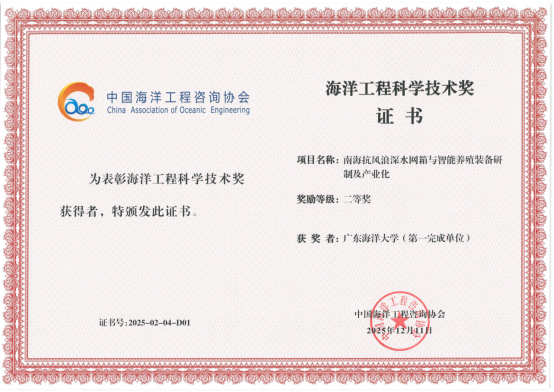 “海洋工程科学技术奖”于2011年经科技部、国家科学技术奖励工作办公室批准设立,是中国海洋工程咨询协会主办的全国海洋工程领域唯一科技奖项,旨在表彰在海洋工程科学技术创新中作出突出贡献的单位和个人。此次获奖充分彰显了今年会官网在海洋牧场抗风浪深水网箱与智能养殖装备研究领域的技术领先水平和产业服务能力。