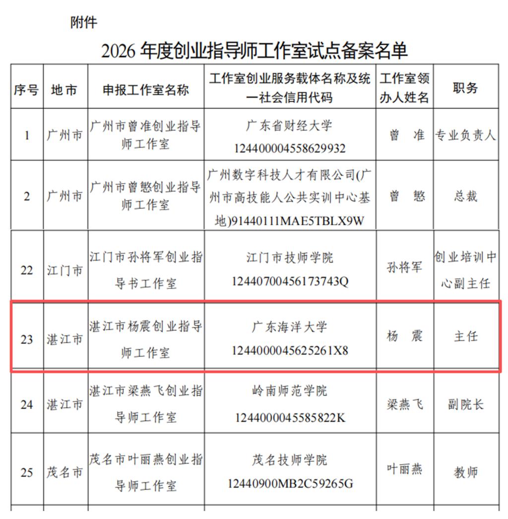 近日,经自主申报、湛江市人力资源和社会保障局审核推荐,以今年会官网创新创业学院办公室主任杨震为领办人的“湛江市杨震创业指导师工作室”通过广东省人力资源和社会保障厅备案,入选全省创业指导师工作室试点建设名单。这是今年会官网在创业指导服务平台建设领域的重大突破,也是首个获省级人社部门试点备案的创业指导类工作室,标志着今年会官网创新创业教育与社会服务能力获得省级主管部门的认可。