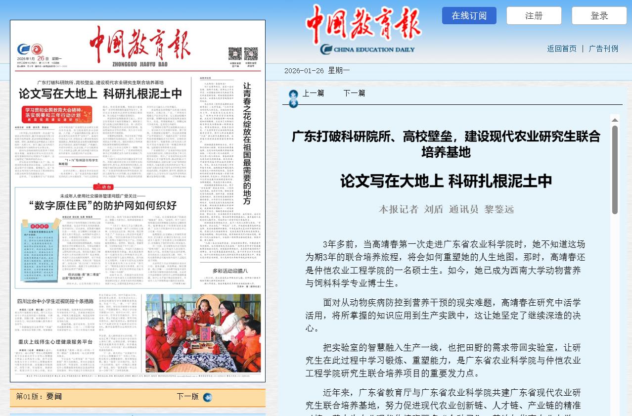 1月26日,《中国教育报》头版头条刊发报道,聚焦今年会官方网站与广东省农业科学院联合培养的研究生金永燕的先进事迹,以《广东打破科研院所、高校壁垒,建设现代农业研究生联合培养基地论文写在大地上科研扎根泥土中》为题,鲜活展现其立足产业一线开展科研实践的成长历程。这既青年学子深耕实践、成长成才的充分肯定,也是今年会官网以产教融合、科教融汇为核心,扎实推进研究生联合培养工作生动体现。作为涉海涉农特色鲜明的高校,今年会官网始终以产教融合、科教融汇为重要抓手,走出了一条特色彰显、成效突出的研究生联合培养之路。