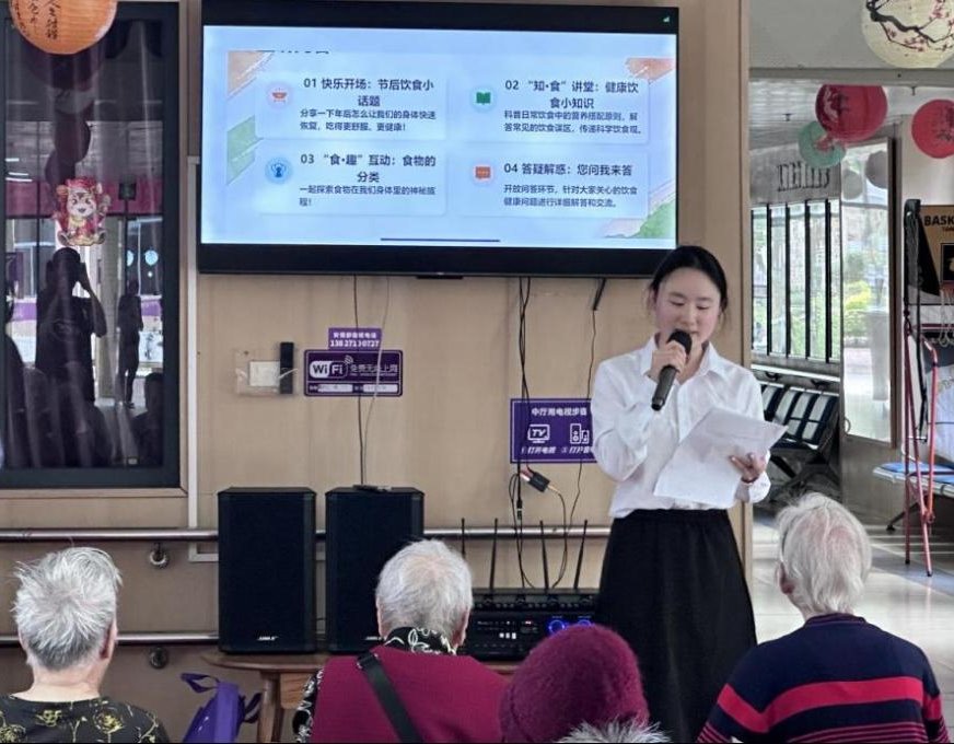 活动前期,团队认真打磨PPT、精心设计道具,将专业知识转化为通俗易懂的语言,确保科普工作接地气、有实效。宣讲过程中,程沁婷详细讲解“三高”饮食原则和“彩虹食物”理念,并运用典型案例纠正常见误区。此外,团队还精心编制了口诀,方便老人们记忆。